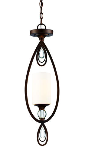 This Daphne one-light miniature pendant light is an elegant focal point. This light has a white opal glass drum shade and graceful teardrop metal detailing. This mini pendant light is delicately suspended from a round ceiling canopy, and crystal accents adorn the up-light shade. The fixture includes 6 feet of chain for height adjustments as well as finish-matched hardware. It can even be installed on a vaulted ceiling.