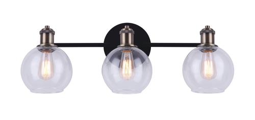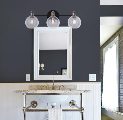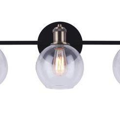 Create a relaxing atmosphere under the glow of the Patriot Lighting® Karris three-light vanity and escape reality as you enjoy a warm bubble bath. Karris comes in two-tone matte black and gold finishes and offers the perfect amount of light from its clear round glass shades and vintage-style bulbs that are included.