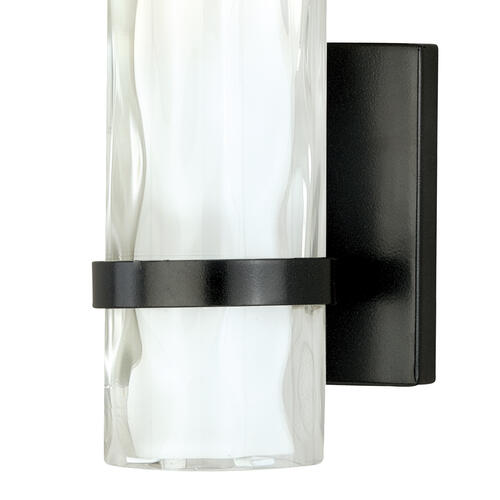 The Vilo collection is a perfect blending of simplicity and sophistication. Flat planes and bands of metal are a striking compliment to the more softly defined columns of water glass. Ample light emanates from the vertical glass shades creating a dramatic effect. These fixtures offer a classy touch to any contemporary space in your home. This wall sconce is ideal for bathrooms, hallways, stairways, and foyers.