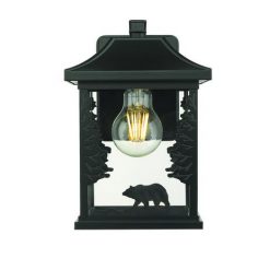 Capture the majestic spirit of the wilderness with the Bear outdoor wall lantern by Patriot Lighting®. Three charming, ambling bear silhouettes circle the square glass lantern shade with tall, sturdy trees bracing the corners, all crafted in durable powder coated black aluminum. A single bulb perfectly lights the arts and crafts inspired rustic scene, creating lodge or cabin ambiance for any front porch or garden.