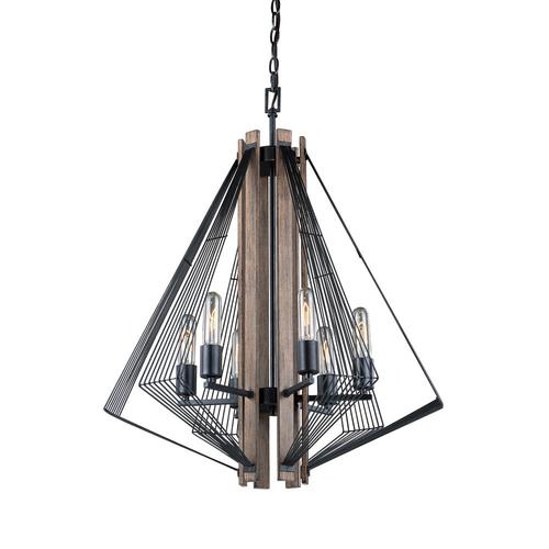Strong geometric overtones clearly suggest a modern industrial flair in the Rochester 6 light chandelier. Black Iron finished wire along with accents of burnished oak are a stunning combination.