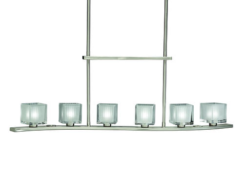 This Glacial 36″ Brushed Nickel 6-Light Island Light is beautifully crafted from durable metal and appointed with clear with inside etched glass. This island light includes the mounting hardware and installation instructions. This light fixture requires (6) 40 watt G9 halogen bulbs (included).