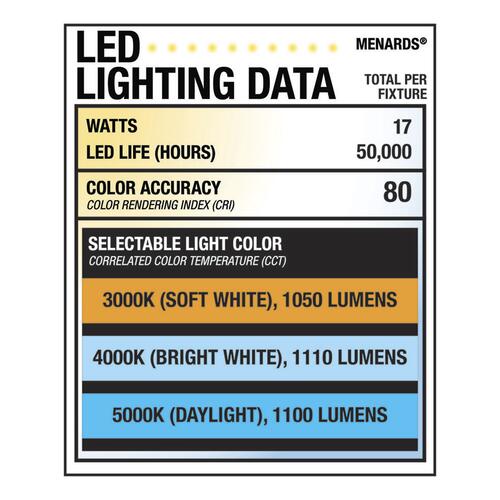 - This LED light has a CRI of 80, can choose from 3,000K (soft white), 4,000K (bright white), or 5,000K (daylight) color temperature, and is 1110 lumens