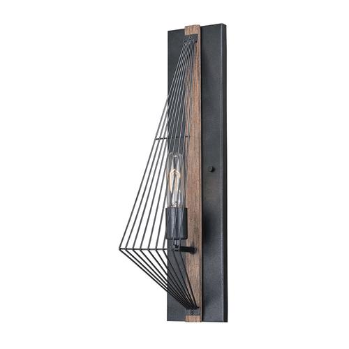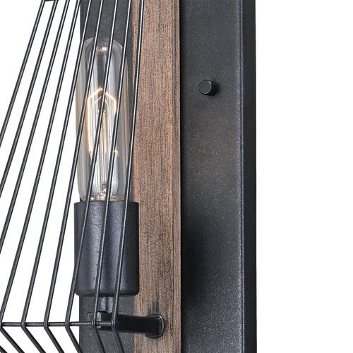 Strong geometric overtones clearly suggest a modern industrial flair in the Rochester Wall light. Black Iron finished wire along with accents of burnished oak are a stunning combination.