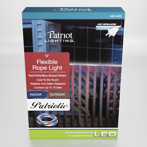 Patriot Lighting 12 FT Red/White/Blue Color Changing Rope Light transforms indoor/ outdoor spaces like no other. Add creative color lighting to tray ceilings, coves, under cabinets, architectural elements and more. Rope Lights feature flexible, heavy-duty, UV inhibiting PVC tubing that resists yellowing and cracking. The energy efficient LED rope lights use about 80% less energy than their incandescent cousins. Connect additional kits for up to 156 ft. of continuous light. Perfect for inside homes to line steps, bottom or top of cabinets, valances, sliding doors, windows or entertainment center. Commonly used outdoors to outline decks, patios, pathways, stairs.