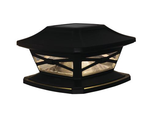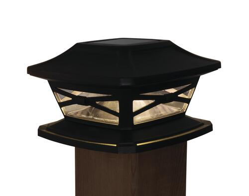 This Patriot Lighting® Crosby Bronze Solar LED Post Cap Light features an attractive profile on all four sides, creating a unique look that will enhance any deck railing or fence post. It features a durable plastic construction and a bronze finish, each with one warm white LED (4.8 lumens light output). It fits a standard four-by-four wood post as well as a six-by-six wood post without the need for additional adapters. It includes the mounting screws and is easy to install as no wiring is required. In addition, it is great for use in areas where there is no electrical supply available. It automatically turns on at dusk for up to eight hours of illumination. It is also available in a copper finish.
