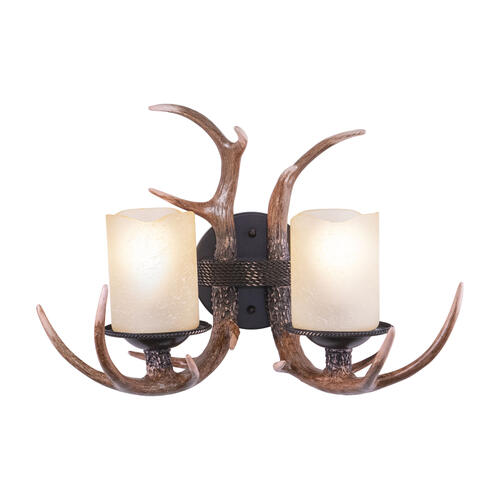 Evoking the spirit of the wilderness, this rustic themed light is clad in a black walnut finish and features cr?me cognac glass. It will complement a variety of home styles bringing an element of nature indoors. The Yoho collection features reproduction deer antlers making it a great choice for a vacation lodge, cabin or suburban homes. This bathroom light is perfect over small vanities or as a pair over double sinks.