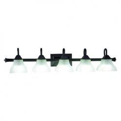 The Cardiff vanity collection features an oil burnished bronze finish with square white alabaster glass shades. The linear details, square shades, and simple form are reminiscent of an updated Mission style.