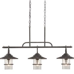 This Miner 36″ 3-Light Island Pendant Light in Bronze is beautifully crafted from durable metal and appointed with clear seeded glass. This island pendant light includes the mounting hardware and installation instructions. This light fixture requires (3) 60 watt medium base bulbs (not included).