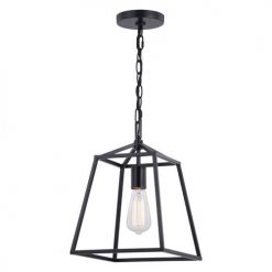 An open cage design and exposed light source define the Hayes pendant collection. Strong geometric lines finished in black surround vintage Edison style filament bulbs to complete the look. The open cage design means there is no glass to clean or fog up. Install these lantern pendants individually or in a group; ideal for kitchens, dining areas, or bar areas. Use this damp rated ceiling light indoors or outdoors; ideal for your covered porch, entryway, or any other area of your home.