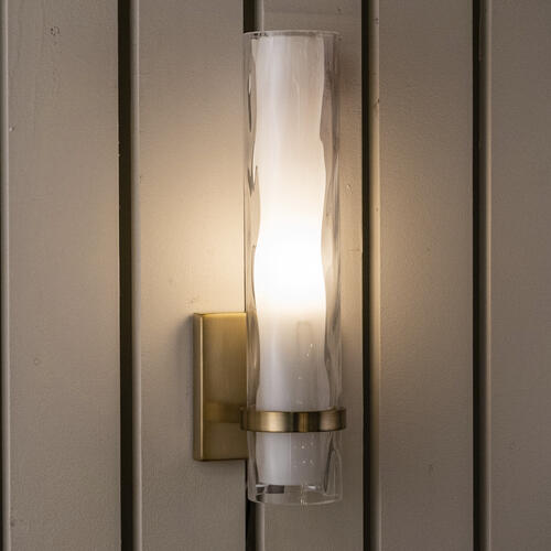 The Vilo collection is a perfect blending of simplicity and sophistication. Flat planes and bands of metal are a striking compliment to the more softly defined columns of water glass. Ample light emanates from the vertical glass shades creating a dramatic effect. These fixtures offer a classy touch to any contemporary space in your home. This wall sconce is ideal for bathrooms, hallways, stairways, and foyers.