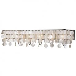 Soft contemporary styling combined with texture and iridescence. The Elsa collection is a unique option to lighten and liven up your bathroom, hallway, stairway, or foyer. Tiers of hand-strung natural Capiz shells create a soft diffused light that perfectly compliments the satin nickel metal elements. This is a full collection with coordinating pieces to decorate any room in the house. Features candelabra lamping, frosted bulb recommended for best appearance.