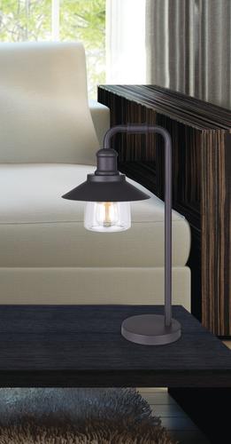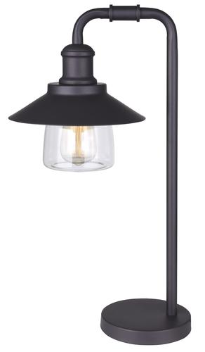 The industrial-era design of the Bynum table lamp is clean and simple with a pipe-inspired arm and classic clear glass to add a tasteful accent to any space. Included is a vintage-style light bulb to complete this classic look.