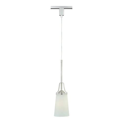 The exquisite line of elongated glass brings individuality to your lighting. This Patriot Lighting® Chambord one-light track pendant in satin nickel with etched white glass features detailing is appropriate for classic or transitional decor. The fixture has a dual mount to convert the track pendant to a ceiling-mount pendant, making it a truly versatile piece.