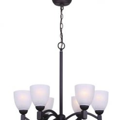 - Includes (1) fixture, (6) glass globes, (1) hardware kit, 5′ chain, and 6′ electrical cord