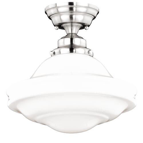The Huntley is a timeless collection inspired by mid-century small-town aesthetics. The vintage school house glass is the focal point of this design with its unique profile and glass options. Offered in multiple finishes and glass options, this versatile farmhouse light will provide a unique accent to a variety of kitchen, dining, and bathroom settings. Medium screw base lamping provides maximum light output. The complete collection includes chandeliers, pendants, semi-flush ceiling lights, and 1, 2 3, and 4 light bathroom vanities.