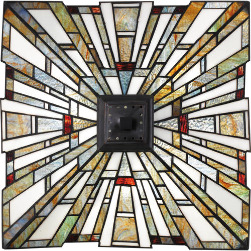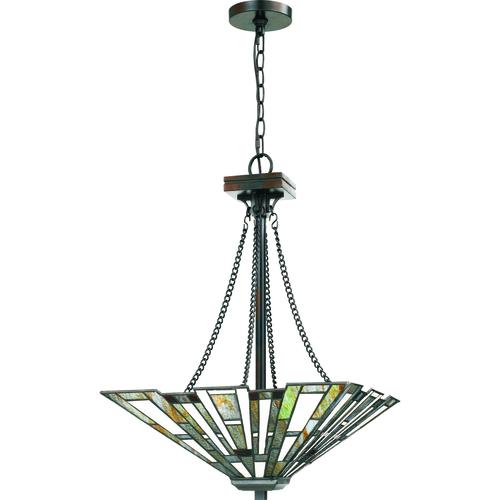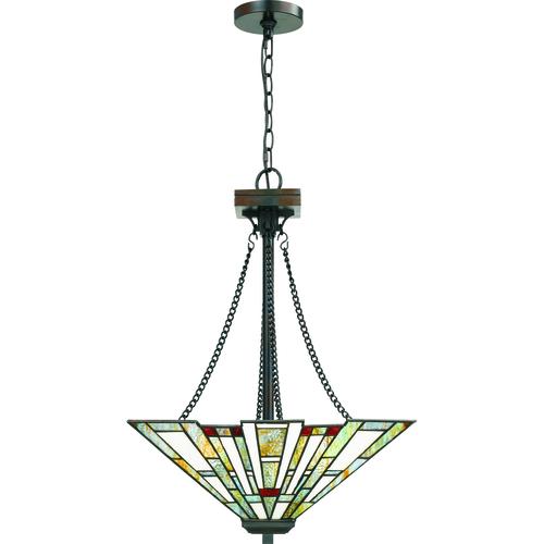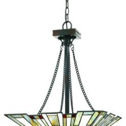 The warm shades of amber, bisque and mossy green of this handcrafted Tiffany-style pendant will illuminate your home beautifully. The clean geometric pattern is complemented by a rich bronze base and is in keeping with the Arts & Crafts style.