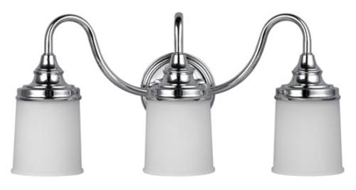 The Barkley three-light 19.5-inch vanity light with opal glass has clean lines and attractive curved arms to hold glass. It is reversible for up or down mounting and requires three 100-watt type A bulbs.