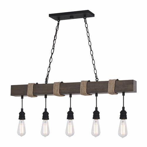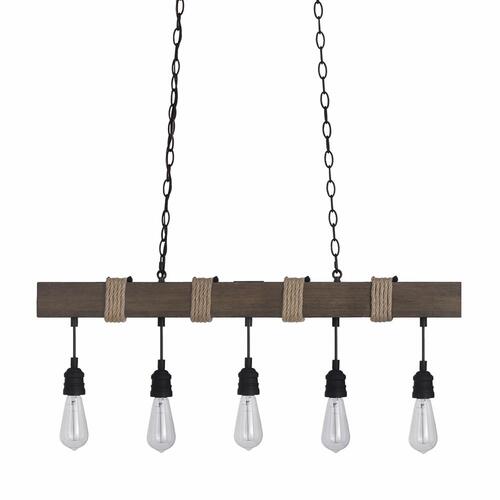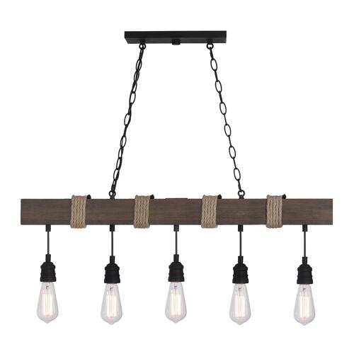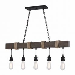 The interesting design of the Patriot Lighting® Joyce Collection blends elements of different styles to create a stunning look. The natural wood and black finish with rope accents are the perfect combination. This light will look stunning over an island, dining table, or game table. You will see that the Joyce Collection will make just the right statement in your home.