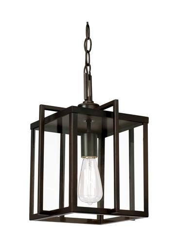 This Brody one-light pendant light blends modern and vintage elements for an eclectic contemporary design. The oil-rubbed bronze finish over the open box frame makes this light suitable for entry areas, stairwells, family rooms, and dining areas. It attaches to a rectangular ceiling plate and is height adjustable using the chain. The bulbs and clear glass panel sides are included.