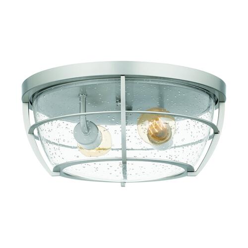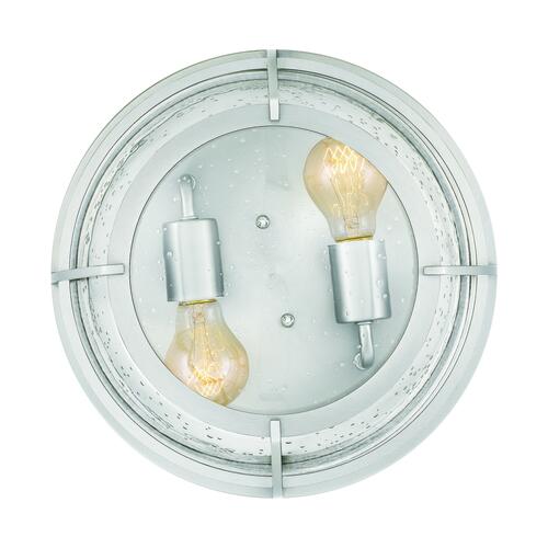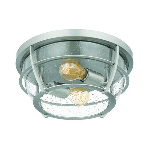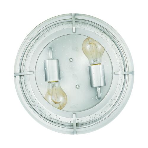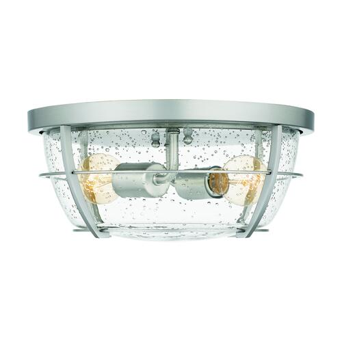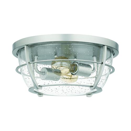 With nautical-inspired elements, this fixture is an ideal style for any home. The brushed nickel finish and clear seedy glass complement the overall design. This two-light flush mount will light up any room with its caged glass design.