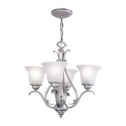 The soft traditional lines of the Monrovia collection allow you to combine styles within your home without compromising on design. The brushed nickel finish and white frosted seeded glass add a certain level of sophistication and elegance that is rare to achieve. Update your look with a hint of class. This fixture is part of a full collection with coordinating pieces to decorate any room in the house. This versatile fixture can be installed two ways; mount as a semi flush ceiling light or use the chain to mount as a mini chandelier. Pull chain on-off switch or wall switch controlled.