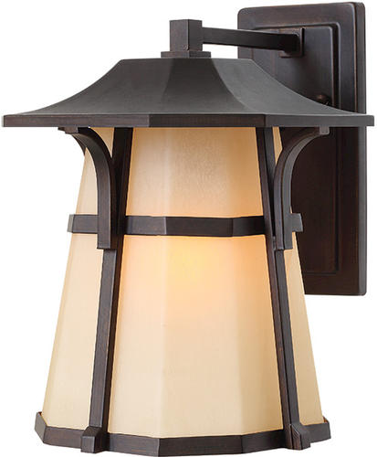 The Patriot Lighting® Oak Park Large 14″ H Bronze Contemporary Outdoor Wall Light is beautifully crafted with an amber etched glass shade (UL listed). It requires one bulb.