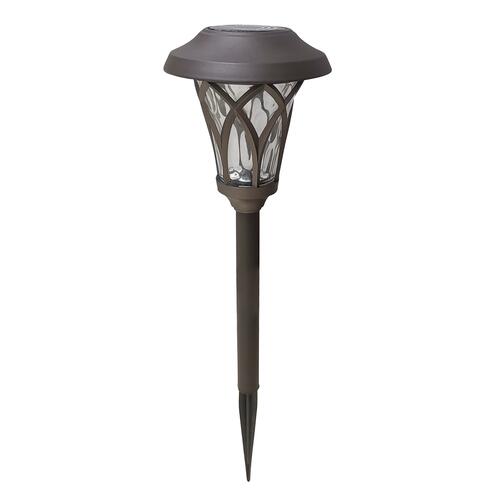 This set of four solar Tioga path lights is sure to enhance any garden setting. This path light features energy-efficient LEDs that are powered by the sun’s rays and are the perfect accent for your flower bed, garden pathway, or driveway. This path light utilizes an amorphous solar panel and a high performance warm white LED bulb that generates 4.8 lumens of light. The built-in rechargeable battery allows the light to automatically turn on at dusk for up to eight hours of nighttime illumination. Place this light in a sunny location for maximum performance. This path light features easy installation with no wiring required.