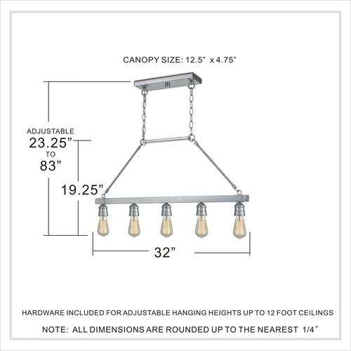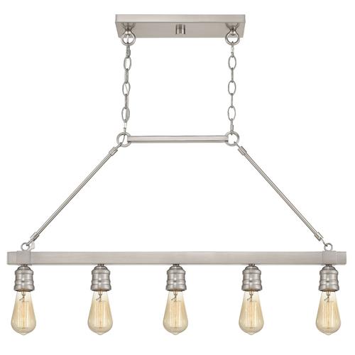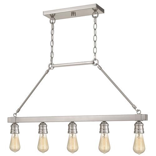 The Patriot Lighting® five-light Beaman island chandelier in a light brushed nickel finish offers an industrial elegance that will become a talking piece in any room. The exposed bulb style adds visual interest and allows for bright, uninterrupted light in any space.