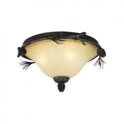 The Pines 15-1/2-inch flush mount combines rustic and classic styling that brings nature indoors. Great for lodges, cabins, and nature-styled interiors, this fixture features black walnut finish and creme cognac glass with pine tree elements. This is a great piece for adding a little character to any room.