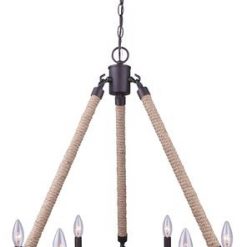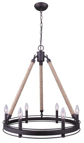 Patriot Lighting® Dawsyn chandelier creates an industrial feel with a rustic rubbed oil bronze finish and open ring details. The natural fiber accents and exposed candelabra bulbs add texture to a room and give it a welcoming feel. Complete the industrial feel of this fixture by adding vintage style bulbs.