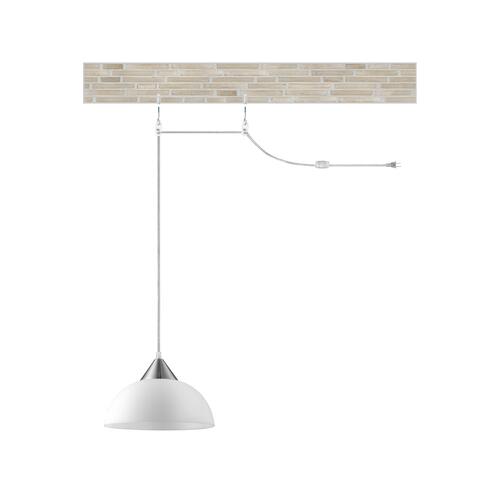 - Brushed nickel finish with white shade