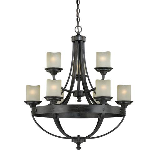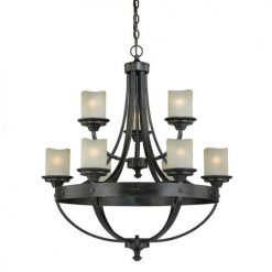 The lancaster 9 light chandelier features a formal yet rustic design in a black walnut finish with a creme cognac glass. This unique shape with thick metal detailing provides a striking look when incorporated into traditional interiors. This chandlier will add style and brightness to your living or foyer areas.