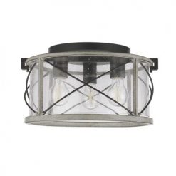 Add style and dimension to your kitchen, living room, hall, or closet with this Patriot Lighting® Lizzie three-light flush mount. At 14 inches tall, this light will brighten up your space. Matte black wire is paired perfectly with a distressed gray faux wood finish and clear seeded glass, giving it a stylish look. Enhance the look with vintage Edison-type bulbs (sold separately).