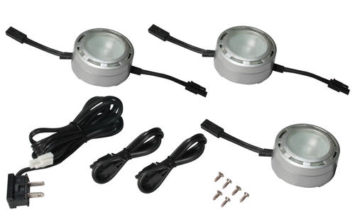 - Includes (3) puck lights, 6′ power cord with roll switch, (2) 12″ linking extensions, (3) 120V xenon bulbs, and mounting hardware
