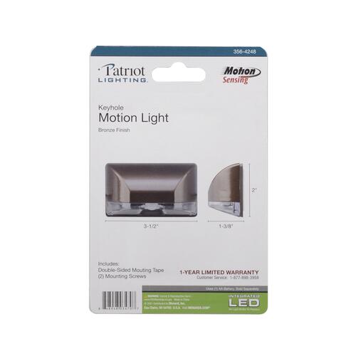 The Patriot Lighting® Keyhole Motion Light features motion sensor which automatically turns light on and off in the dark based on movements of human body. Small size can be used almost all places where light is needed for you in the dark, keyhole, kitchen, hallway, stairway, safe cabinet and etc. The included double-sided mounting tape and two mounting screws is easy for installation.