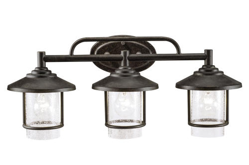 Patriot Lighting® Elegant Home Miner 24-1/2-inch bronze three-light vanity light is beautifully crafted and appointed with clear seeded glass.