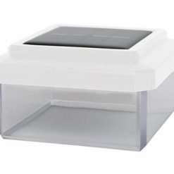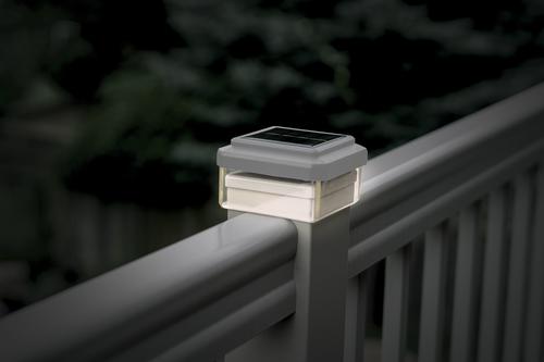 The Patriot Lighting® Harlan Solar LED Four Pack 2-1/2″ Rail Cap Light Set features an attractive profile on all four sides, creating a unique look that will enhance any deck railing or post. Each light is made of durable plastic construction with a white finish and clear lens, each with eight warm white SMD LEDs (eight lumens light output). It will fit 2-1/2″ x 2-1/2″ rail posts and is very easy to install as no mounting hardware is required. It automatically turns on at dusk for up to eight hours of illumination. This product is also available in black.