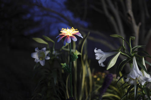 The Patriot Lighting® Magnolia Solar Flower Stick Light is a new, attractive design highlighted by layered metal flower petals and featuring 10 soft white LEDs interwoven into the top of flower. With an above ground height of 30.5 inches, this will stand tall in your garden around your flowers or landscaped areas. Place this light in a sunny location for optimal performance, as the solar panel uses the sun’s rays to charge the battery during the day. It automatically turns on at dusk for up to 8 hours of illumination.