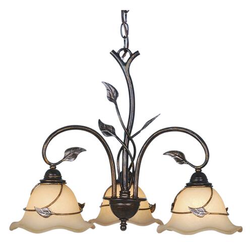 Bring a little of the outdoors inside with the Vine collection. Inspired by nature, this rustic collection features a dark oil shale finish. The amber flake glass shades are scalloped softening the overall feel. Elegantly curved arms are sprinkled with delicately crafted leaves completing the look. This full family of fixtures has something for every room in your home. This chandelier is ideal for kitchens, dining areas, and foyers.