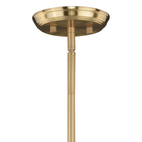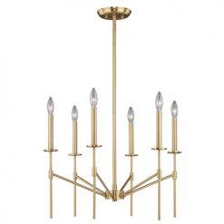 Sculptural elegance is informed by simplicity of line in this mid-century modern collection. The Kedzie makes a distinctive historical reference with a playful touch in its formal symmetry. The Kedzie full living collection, including a nine light chandelier and two light wall sconces, each feature a natural brass finish to compliment any room and design motif. Allow yourself to be a trend setter with this distinctive look. Ideal for kitchens, dining areas, and foyers.