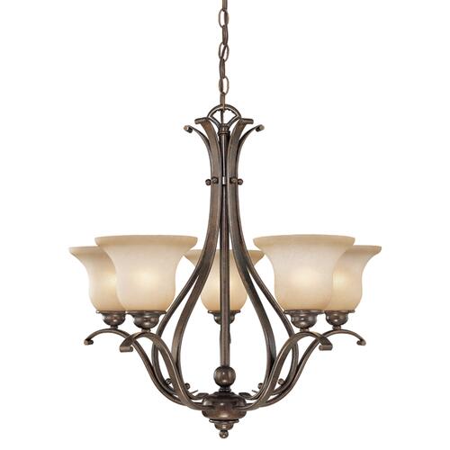 The soft traditional lines of the Monrovia collection allow you to combine styles within your home without compromising on design. The royal bronze finish and brushed cognac glass add a certain level of sophistication and elegance that is rare to achieve. Update your look with a hint of class. This fixture is part of a full collection with coordinating pieces to decorate any room in the house. This chandelier is ideal for kitchens, dining areas, and foyers.